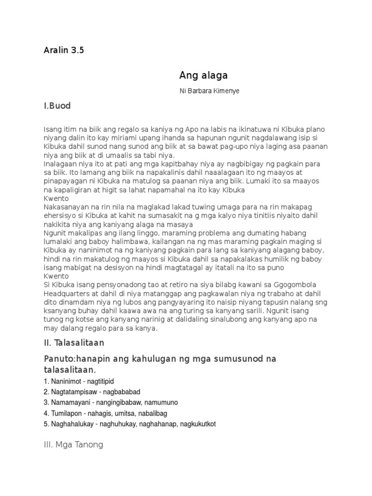 Ang alaga buod barbara kimenye. Isinulat ito ni BARBARA KIMENYEIto ay tungkol kay KIBUKA. ANG ALAGA AY ISANG MAIKLING KWENTO NA NAGMULA SA AFRICA. Ang Alaga Ni Barbara Kimenye Isinalin sa Filipino ni Prof.