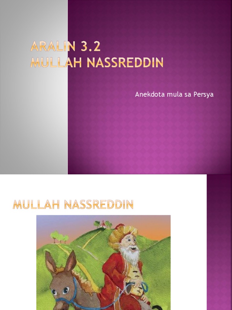 Anekdota ni Mullah Nassreddin Nagpasalin-salin sa bibig ng mga tao ang kaniyang mga naisulat mula noon magpasahanggang ngayon. Mullah Nasreddin Buod Isang tanyag na manunulat at komedyante si Mullah Nasreddin o Mulla Nasser-e Din MND sa tunay na buhay. FTinagurian din siyang alamat ng sining sa pagkukuwento dahil sa mapagbiro at puno ng katatawanang estilo sa pagsulat.