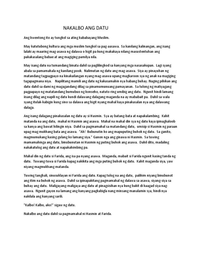 Nakalbo ang Datu Kuwentong-bayan Mindanao Ang kuwentong ito ay tungkol sa ating kababayang Muslim. Sa kanilang kalinangan ang isang lalaki ay maaaring mag-asawa nang dalawa o higit pa kung makakaya nilang masustentuhan ang pakakasalang babae at ang magiging pamilya nila. May katutubong kultura ang mga Pilipinong Muslim tungkol sa pag-aasawa.