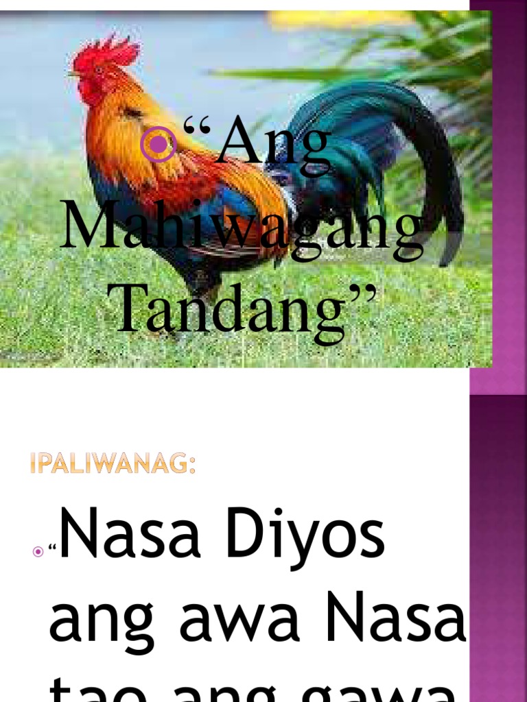 At kung nagdasal ka ang Diyos ay bahala sa iyo at gagawin niya ang Mabuti para sa iyo o yung kinakailangan mo dahil mahal niya tayong lahat. Ang mahiwagang tandang fil 7. Ang kwento ng Mahiwagang Tandang ay Isang alamat na nagbibigay linaw sa tanong na Bakit tumitilaok ang lalaking manok tuwing madaling arawAng pangunahing tauhan dito ay si Sidapa na siyang Bathala ng Digmaan.