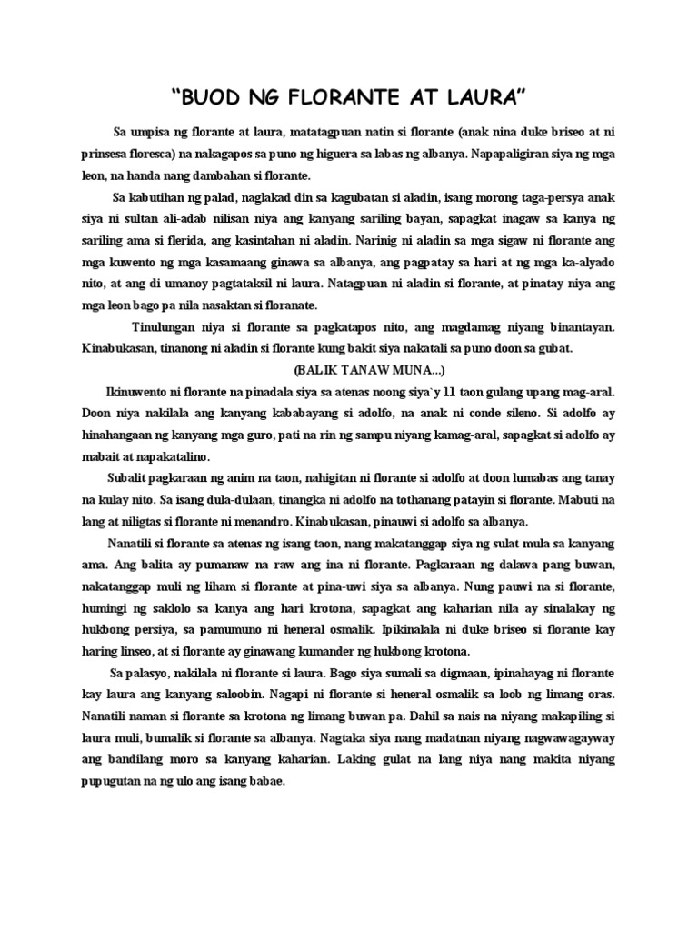 Floranre at laure buod. Ang kuwento ng Florante at Laura ay nagsisimula sa isang madilim na gubat sa may dakong labas ng bayang Albanya malapit sa ilog Kositong na ang tubig ay makamandag. Florante - Defender of Albanya and a good son of Duke Briseo Laura - The daughter of King Linseo of Albanya. Florante at Laura Aralin 8 Kamalayang Panlipunan Aralin 8 5.