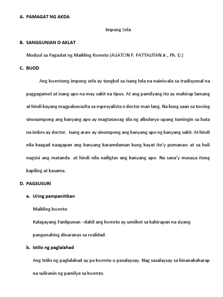 Maikling Kuwento - Impong Sela. Answers is the place to go to get the answers you need and to ask the questions you want. Panimulang Gawain PANGGANYAK Ipapabunot ng guro ang mga mag-aaral sa isang kahon.